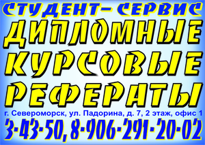 Дипломные, курсовые, рефераты на заказ в Североморске. Качество! Гарантия! Договор! Сжатые сроки! Все работы выполняют преподаватели. Тел:89062912002. Адрес: Североморск, ул. Падорина, д. 7, 2 этаж, офис 17.